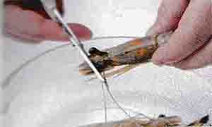 1.去蝦須及腳 剪除頭部的蝦須及尖刺以及腹部的蝦腳等。 |